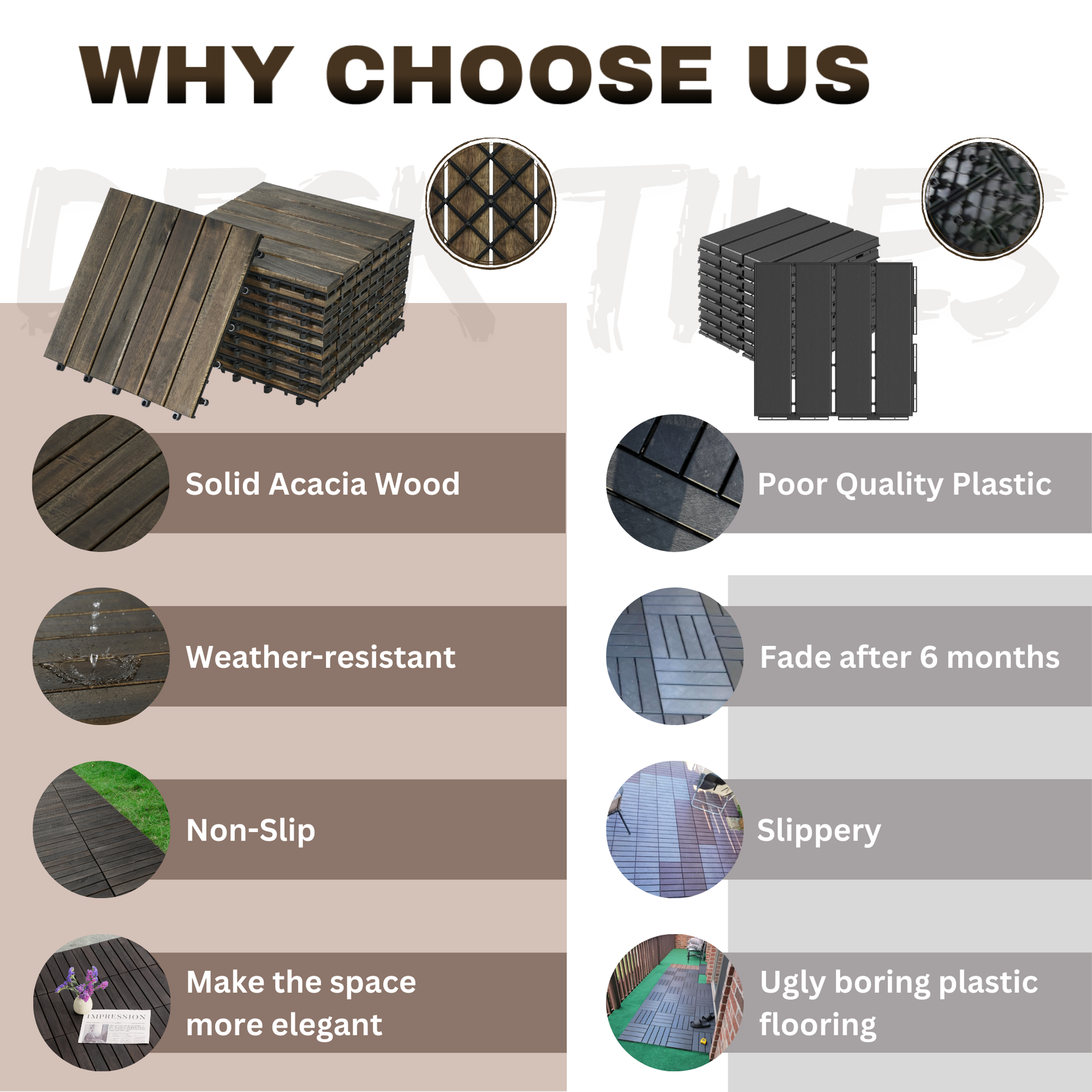 Perfect Size: Each tile has a square shape of 12 inches x 12 inches with 0.75 inches thickness. The wood part is 0.47 inches thick and the plastic part is 0.28 inches thick enough for drainage during the rainy season.