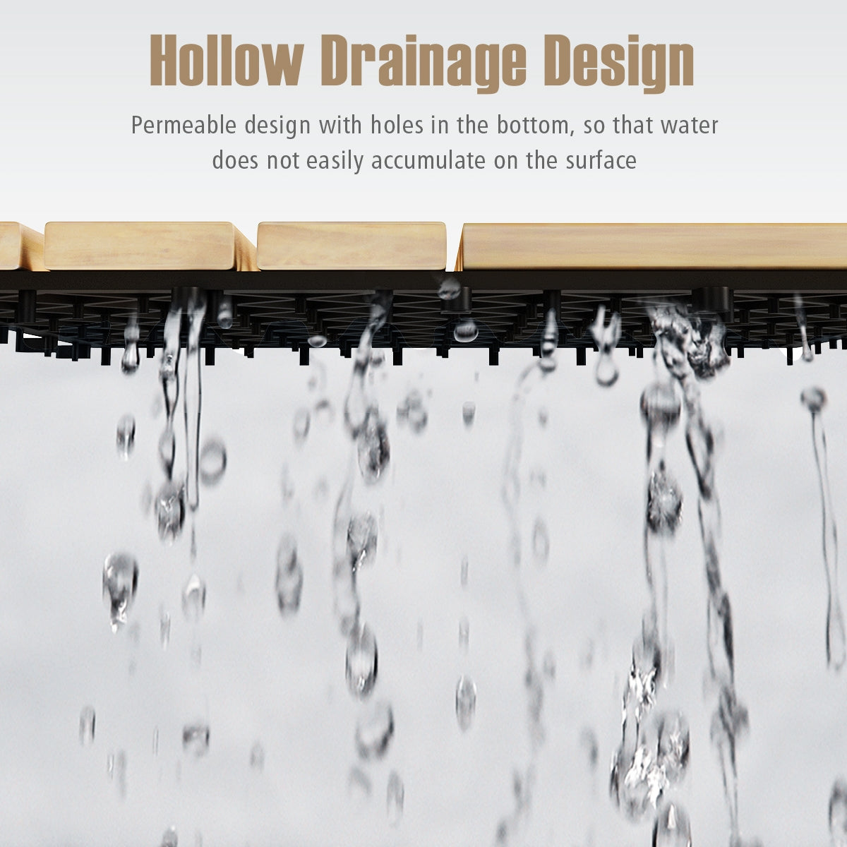Made of solid acacia wood these weather-resistant and highly durable decking tiles can have a long service life to use. The PVC plastic base of tiles allows for plenty of drainage to avoid ponding. Thanks to its easy-to-assemble plug-in connection the tiles can interlock easily and tightly to form the stable walking surface not easy to slippery. Elegant and natural wood floor tiles features exquisite wood texture aiming to build a relaxing area for enjoying the serenity and finding peace of mind. If you are looking for such product don't hesitate to place an order! Multiple splicing methods to form different patterns Made of solid acacia wood and PVC plastic base for durability PVC plastic base allows for adequate drainage and ventilation Interlocking design is easy to assemble or disassemble Withstand fluctuating weather to maintain its appearance and integrity at same time Wooden surface brings rustic style to your home decor Perfect for garden balcony poolside and bathroom Lightweight and portable taken to any place you desired Easy to clean