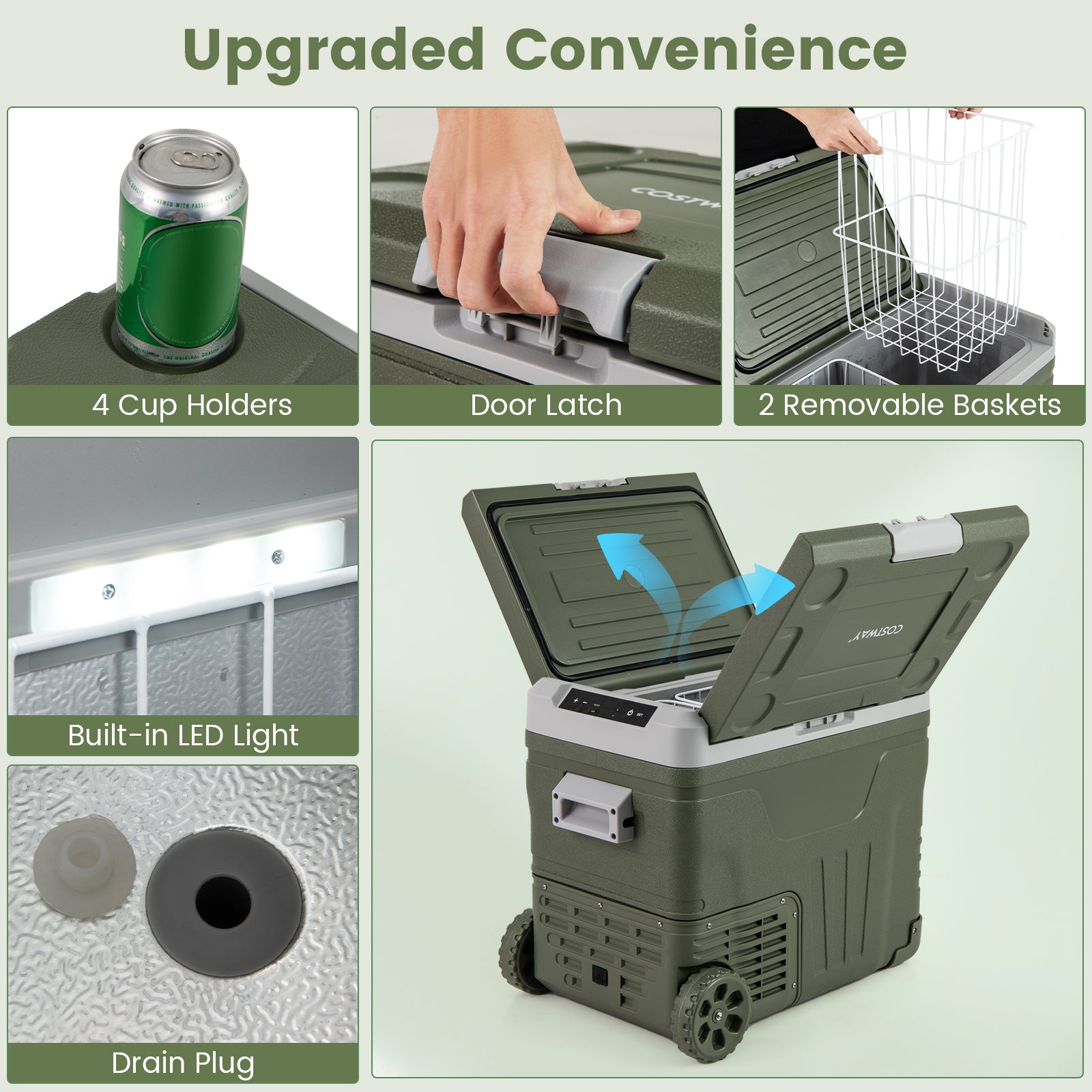 Adjustable temperature from -4°F to 68°F keeps everything fresh Large capacity holds up to 42 cans of 330ml cola/71 cans of 330ml cola2 modes: HH mode for fast cooling ECO mode for energy saving Can be powered by both 12/24V DC and 100-240V ACBuilt-in LED light for better visibility in low-light conditions3-level battery protection avoids damage to your car's batteryLeft or right revisable lid opening options meet different needsTouch panel & LCD display make operation simple Temp +/- HH/ECO mode power on/off ℃/℉switch Pull handle and 2 wheels for easy transportation Easy to drain out water by removing the drain plug Door latch prevents any unwanted opening 35° anti-tilt for smooth and steady runningIdeal for indoor and outdoor use
