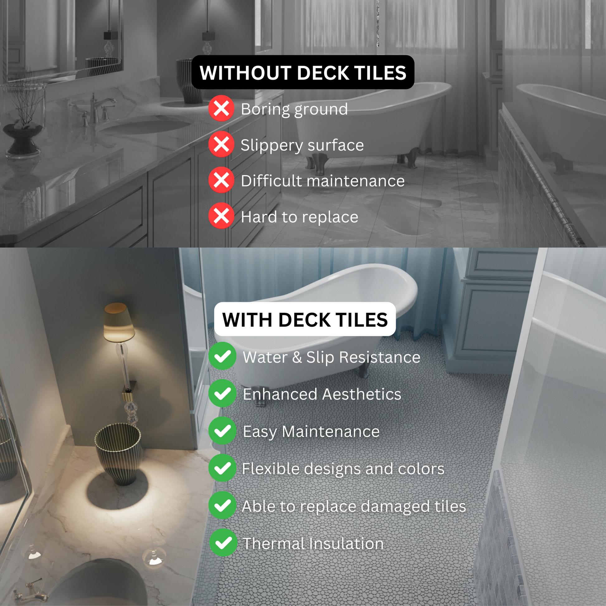 LIGHTWEIGHT BUT STURDY: our interlocking deck tiles, made from high-strength plastic. With superior stability, they're perfect for outdoor flooring, patio tiles, or even as pavers for an outside walkway. Resistant to expansion and capable of enduring various weather conditions, they're suitable for year-round usage in your backyard, balcony, or any outdoor space. More waterproof and durable than wood, these deck tiles provide a reliable solution for patio flooring outdoor waterproof needs.