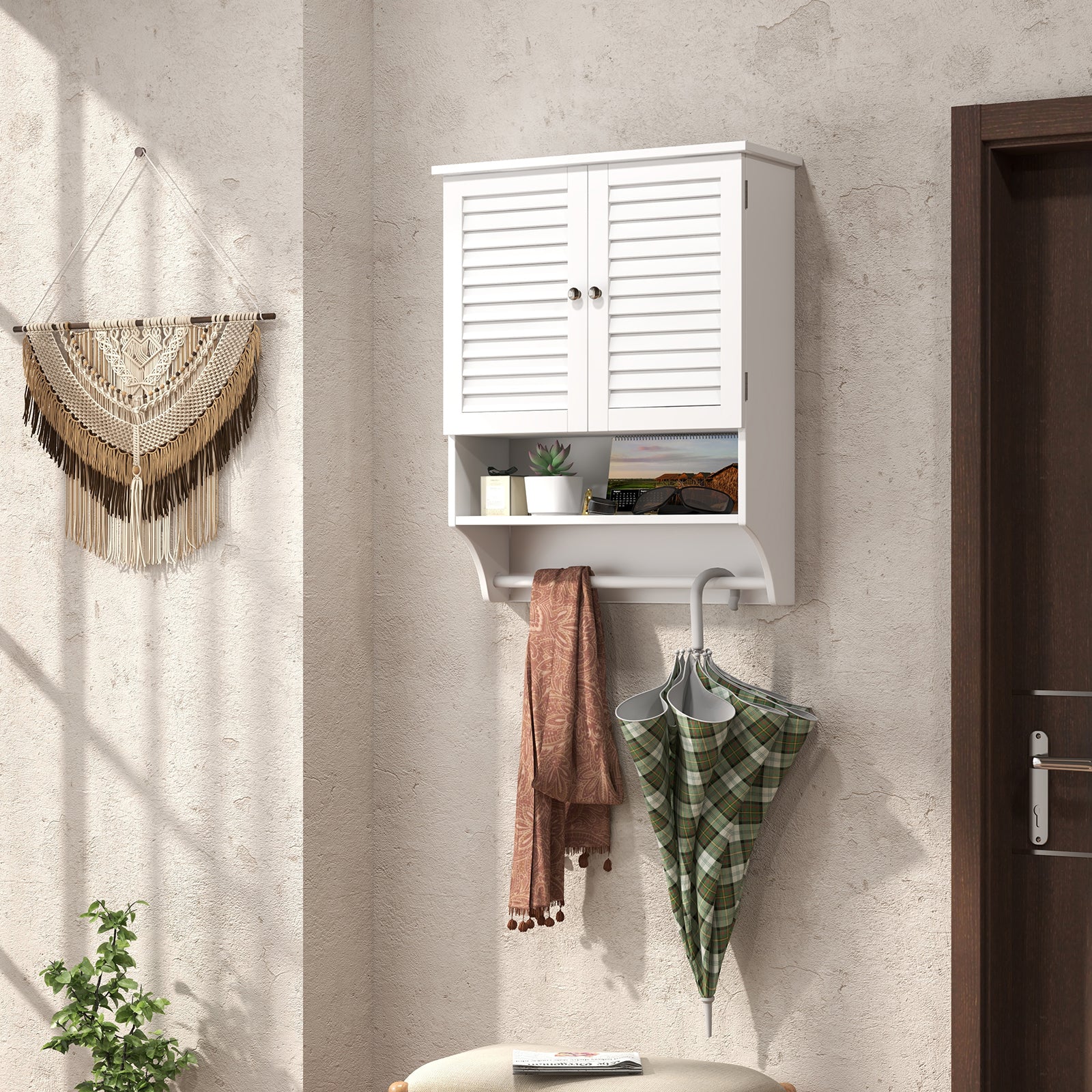 Multiple storage areas provide classified storage solution3-level adjustable shelf for objects of different heightsBottom towel rod for extra storage choiceDurable material and stable design for long-term useWall mounted design for space-saving purposeLouvered doors for better breathabilityConvenient knobs for easy opening or closingMagnetic door catch and metal hinges for firm closingDetailed and illustrated user's manual for simple installationSmooth surface with waterproof paint for easy maintenance