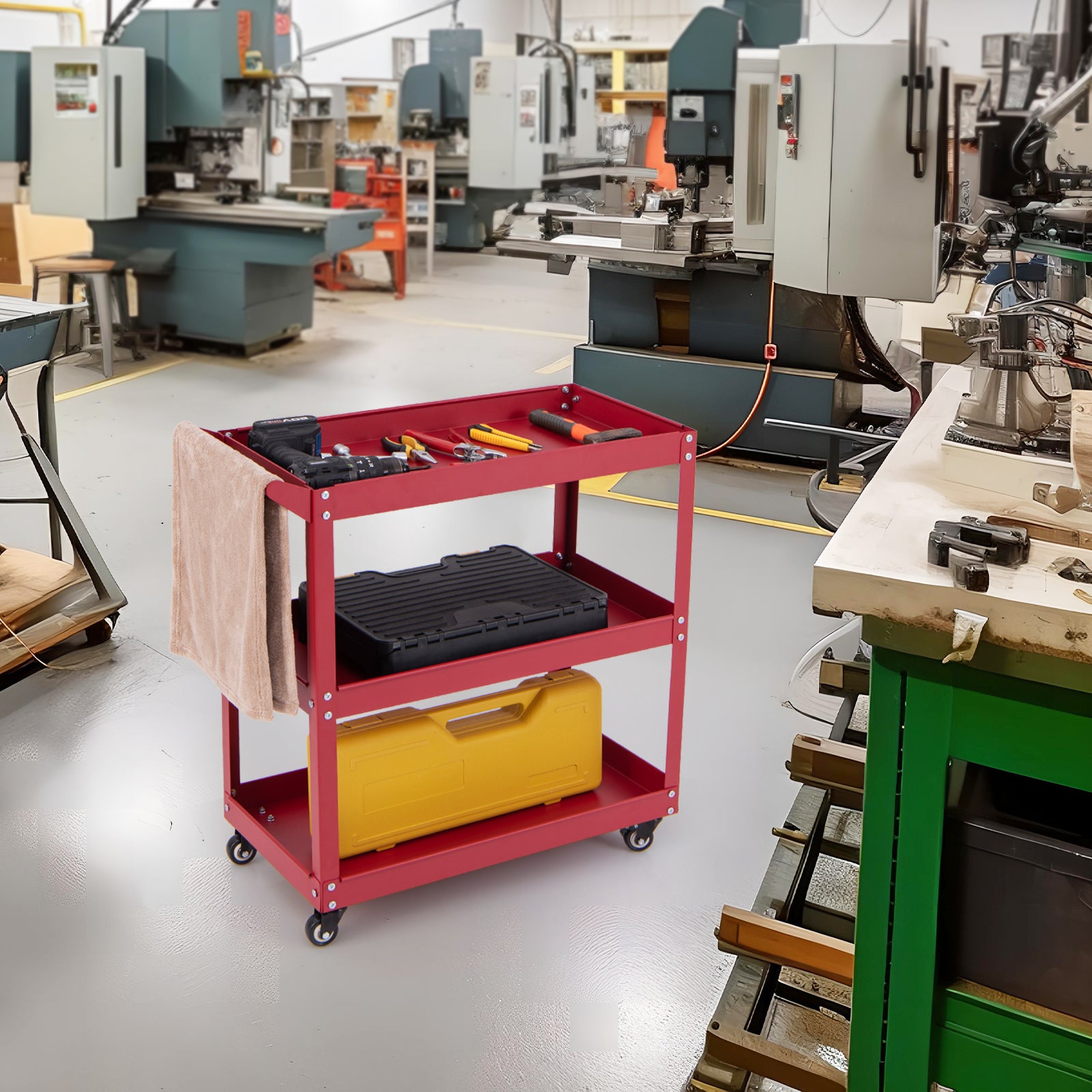 Features 3 large shelves for ample storage spaceHeavy-duty metal frame for 270 lbs max loadIncludes 4 universal wheels for mobility2 wheels are lockable for added stabilityDesigned with 2'' raised edges on each shelfFunctional handle doubles as a towel hangerIdeal for tool room warehouse garage etc.