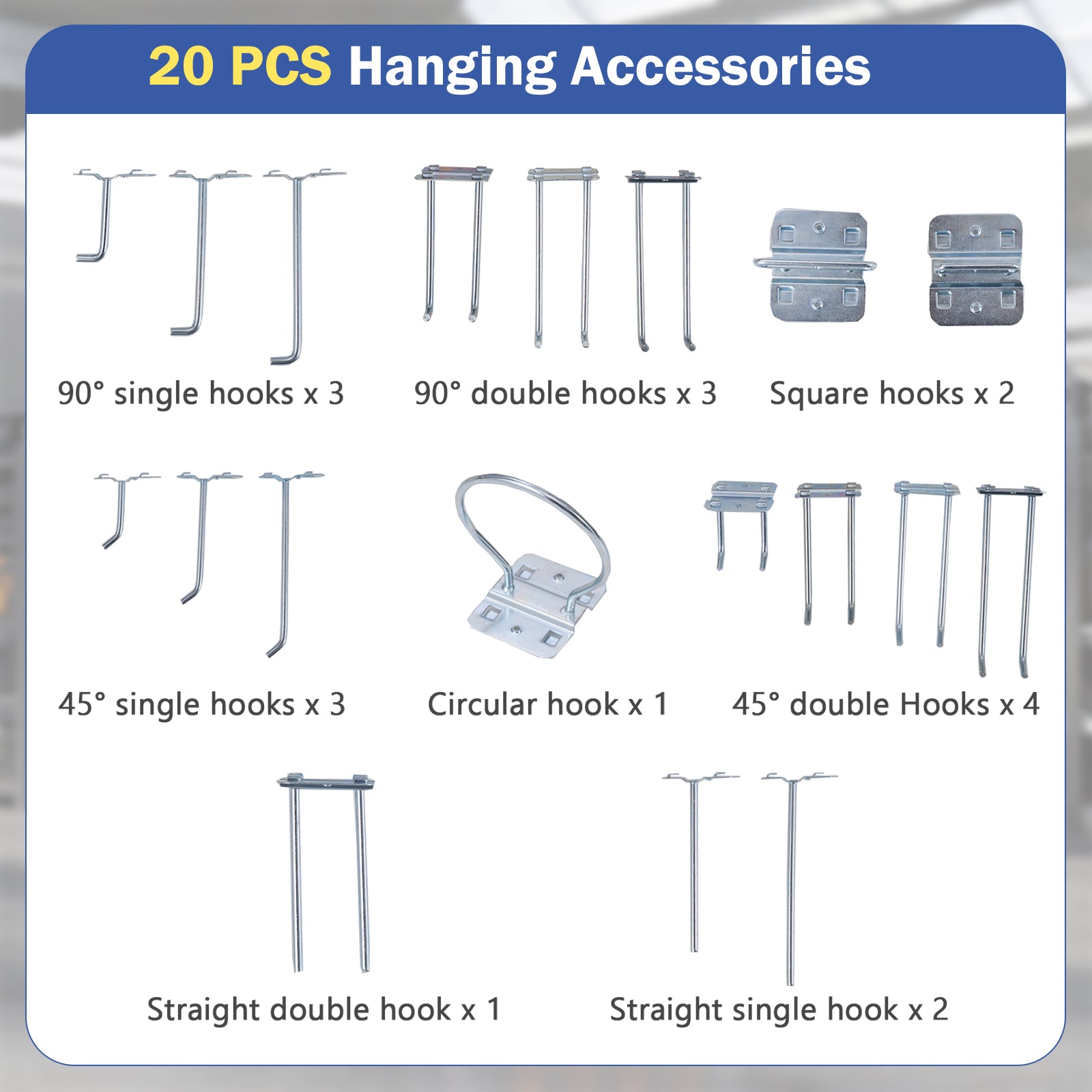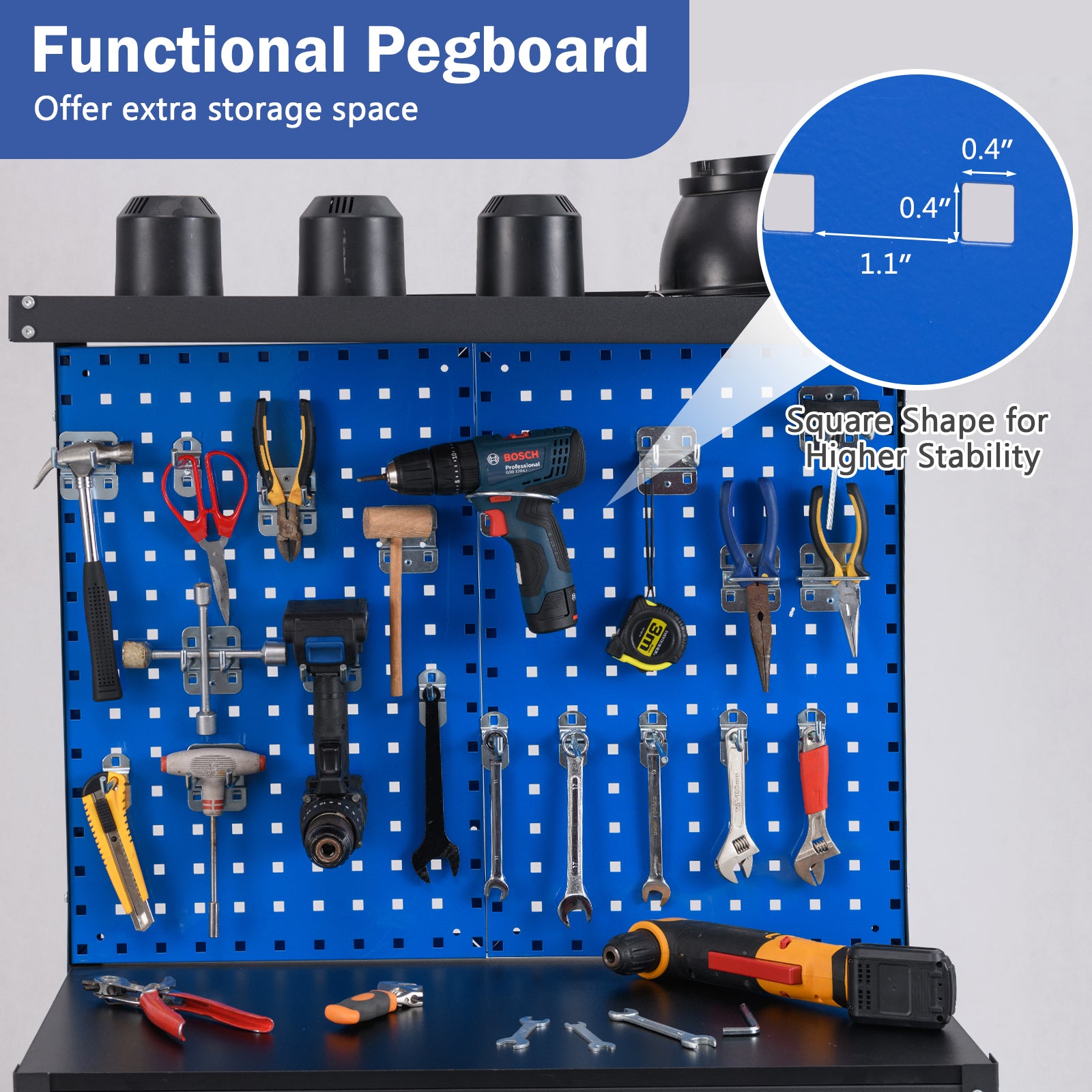 Heavy-duty metal frame for 495 lbs total max loadEquipped with a top shelf 2 pcs pegboards a tabletop a drawer and 2-tier shelf2 pegboards add more storage spaceSquare hanging holes can load heavier itemsComes with 20 hanging hooks in different shapesSmooth drawers slide and convenient drawer handle make it easy to close and openAnti-slip footpads protect the floor from scratchesIdeal for home garage workshop and so on