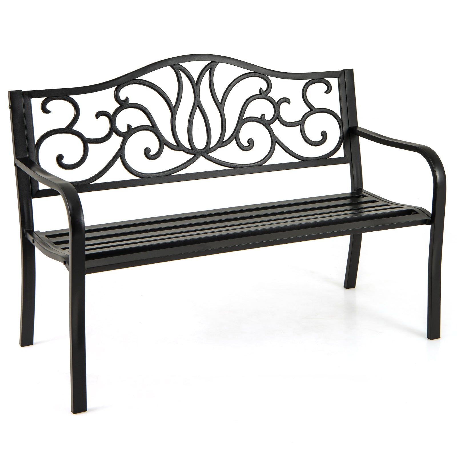 50 Inches Outdoor Garden Bench with Floral Design Backrest and Slatted Seat-Black