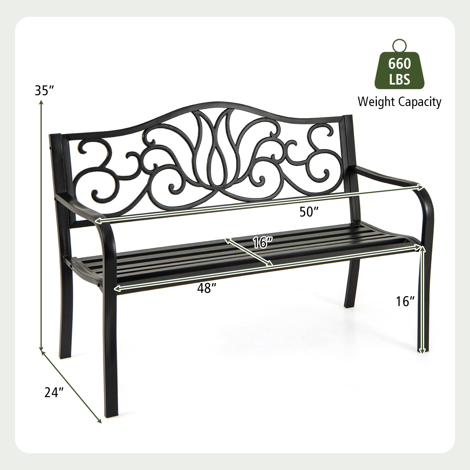 Ensure stable and reliable support with sturdy metal construction Come with strong loading capacity of up to 660 lbs Anti-slip foot pads for additional stability The floral scroll design makes it a visually appealing addition to your outdoor setting Set up to 2-3 people making it ideal for gatherings or quiet moments 105° inclined backrest cozy armrests and contoured seat for ergonomic support Breathable slatted surface for a comfortable and cool seating experience Suitable for patio garden deck front porch balcony and backyard Please avoid rain exposure for prolonged service life Make it safe to sit thanks to the protective caps 3-step simple assembly for time-saving and labor-saving