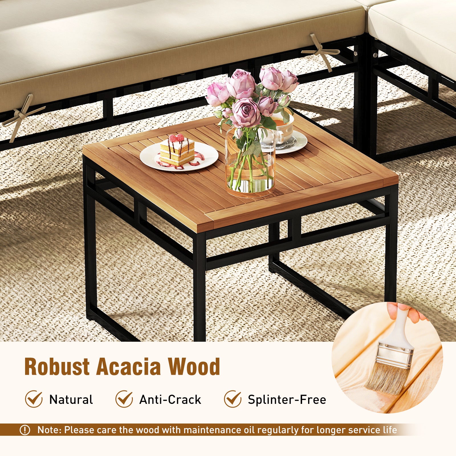 Heavy-duty metal frame offers strong supportFirm screw connection for strengthened structureAcacia wood tabletop armrest and backrest for natural eleganceCross-woven bungee rope provides elasticity and supportEnjoy optimal cushioned comfort with soft and elastic spongeZippered cushion covers for easy removal and cleaningFixing ties keep cushions in placeFlexible combination meets different needsSuitable for backyard porch poolside and so onAssembly is requiredPlease avoid rain exposure for prolonged service life