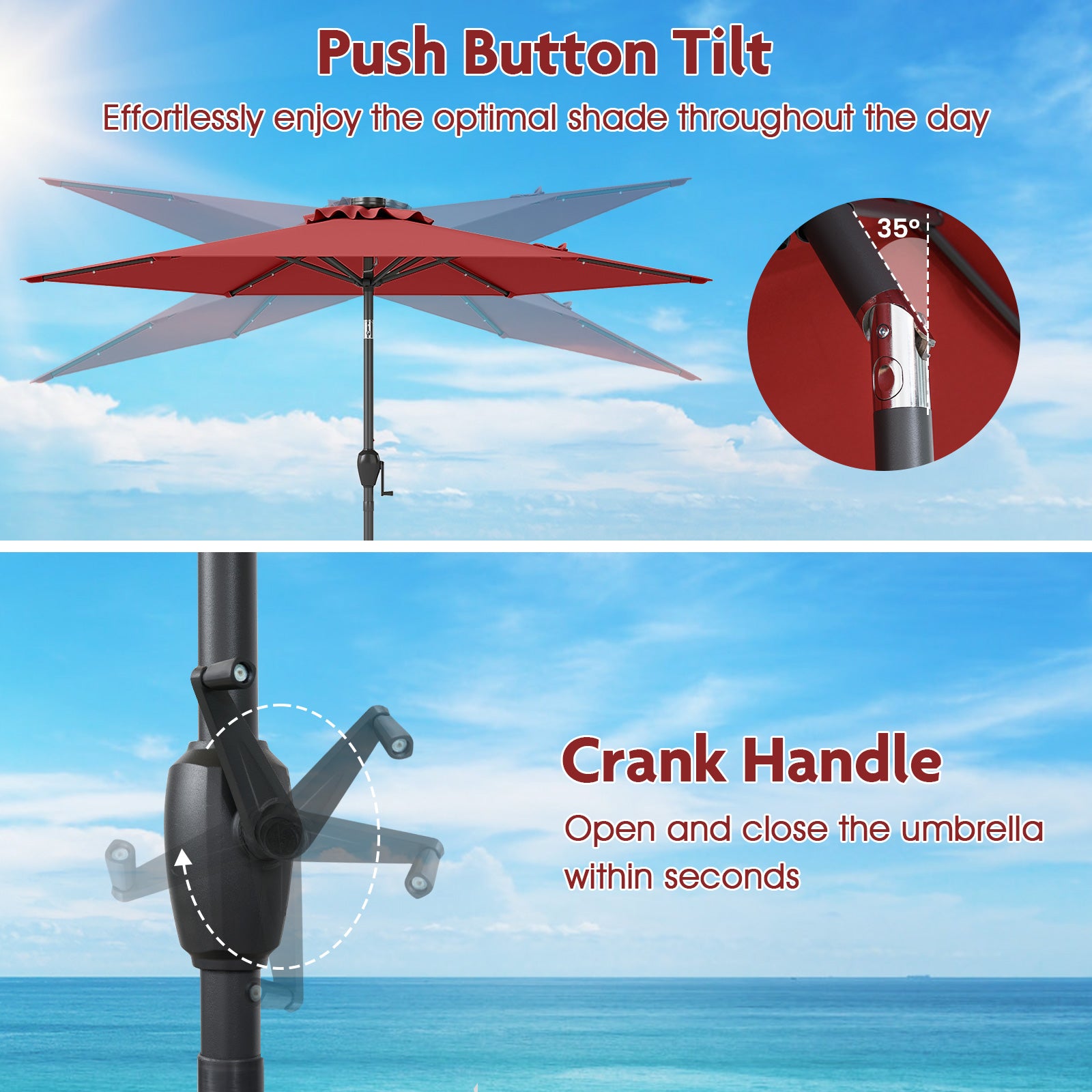 18 light beads create a romantic atmosphereEnergy-saving solar panel runs for 6 hours after being fully chargedSwitch on the pole is easy to access(please turn off it during the day)Sun-proof polyester fabric is wear-resistant and anti-fadingEffortlessly enjoy the optimal shade throughout the day with push button tiltCrank handle allows you to open and close the umbrella within secondsFeaturing an air vent to offer extra cool and improve stabilityThick heavy-duty umbrella ribs promise a sturdy structureDetachable 2-section poles and fixing strap allow for easy storageReinforced rib pockets keep the umbrella ribs in placeNote: Weighted umbrella base is required(not included)Assembly needed