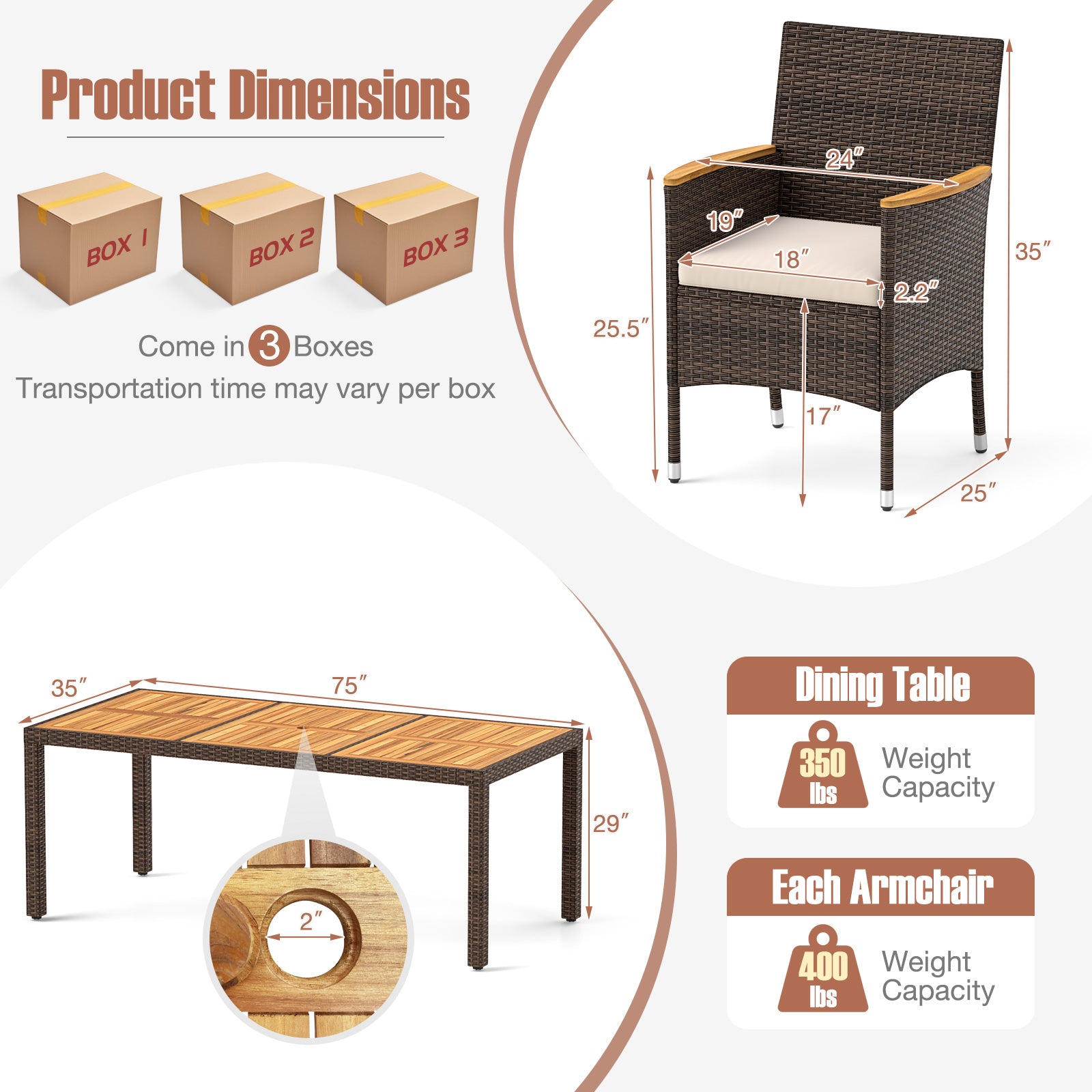Dining table with acacia wood top offers long-lasting beauty and strengthMix brown PE rattan is sun-protective fade-resistant and breathable Crafted with a robust metal frame that is stable and long-lastingHigh backrest and curved armrests for added comfort and supportSoft padded cushions offer extra comfort for extended outdoor mealsRemovable zippered cushion cover for easy cleaning and maintenanceA 2'' umbrella hole to accommodate a patio umbrella (umbrella not included)The umbrellas stand is needed 6 chairs tuck under the table for a neat and tidy outdoor areaChair front legs with adjustable foot pads for enhanced balanceTable legs come with non-slip foot pads to protect your patio surfaceRegularly oil the wood surface for optimal maintenanceTo extend the service life please avoid prolonged exposure to rainAssembly required