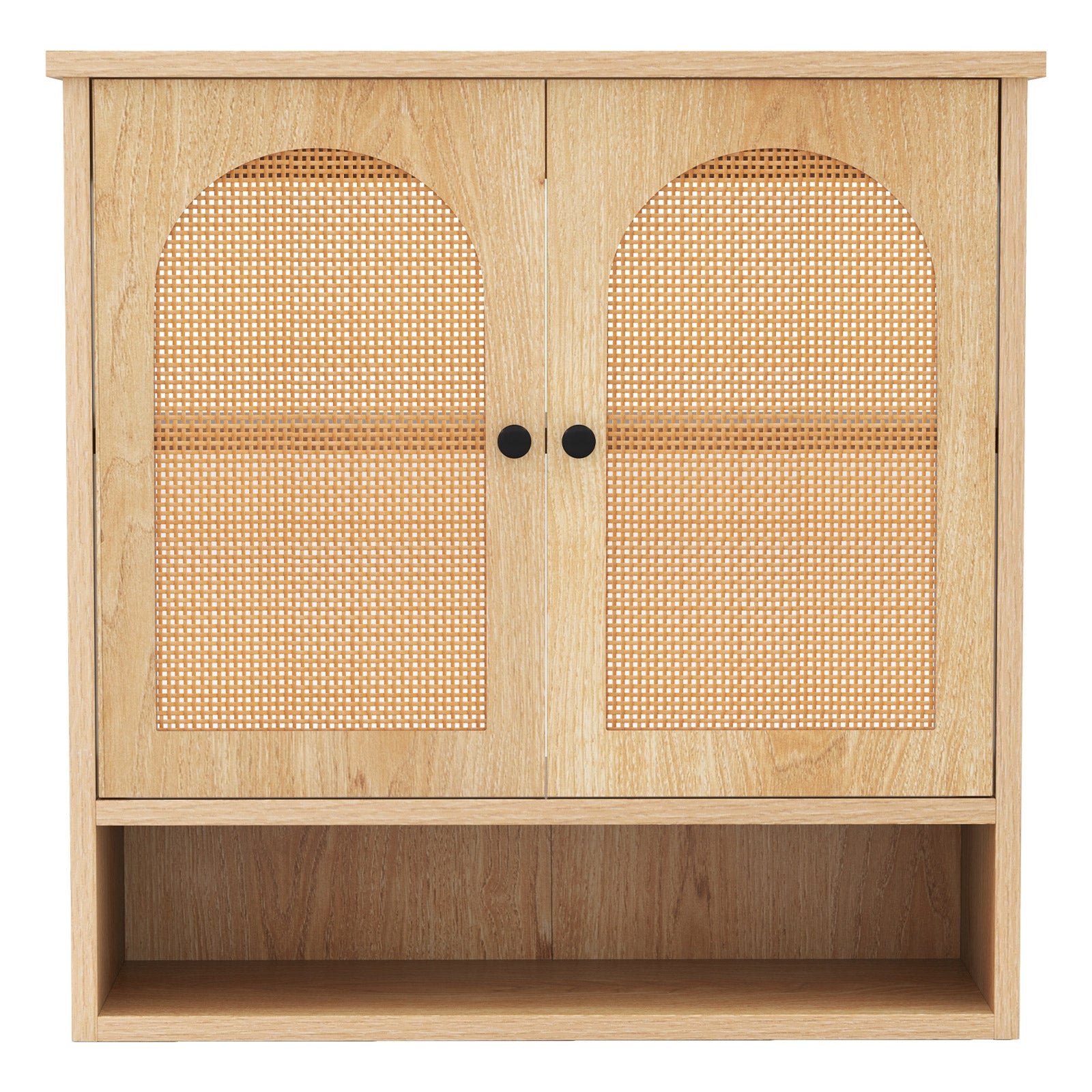 Bathroom Wall Cabinet with Adjustable Shelves Open Cube and Rattan Doors-Natural