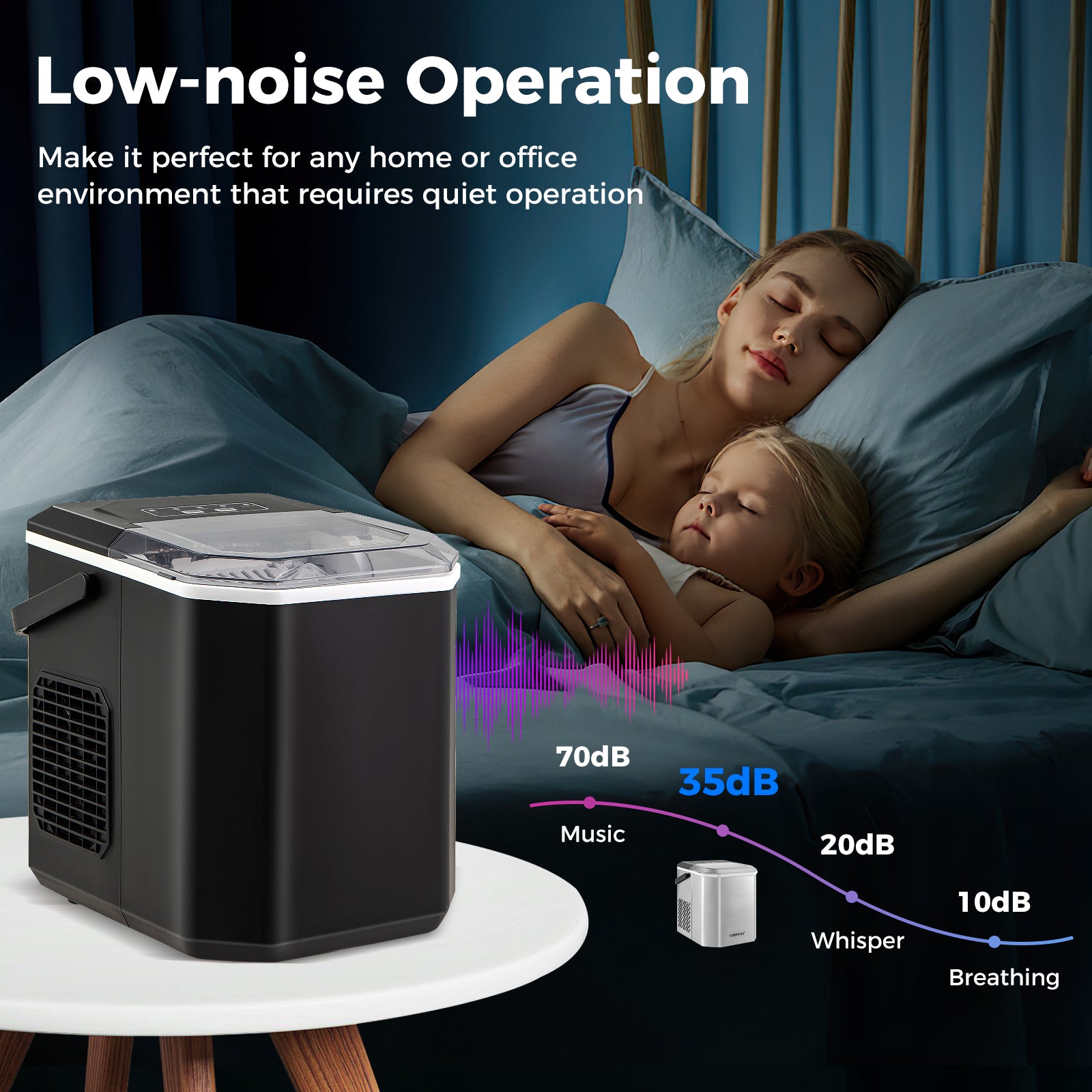 Produce 9 bullet-shaped ice ready in 6-13 mins for fast ice making Prepare for any party or gathering with 26.5 lbs of ice production per day 1.3 lbs ice basket for ice storage capacity 4-6H ice retention to preserve ice integrity The noise lower than 35dB for low-noise operation 2 sizes of bullet-shaped ice (small or large) for your selection Included ice scoop and basket for great convenience Simple to use with one-button operation Include ice full reminder add water indicator and ice size selection Make maintenance easier with self-cleaning function Allow you to easily lift and move the ice maker wherever needed with portable design