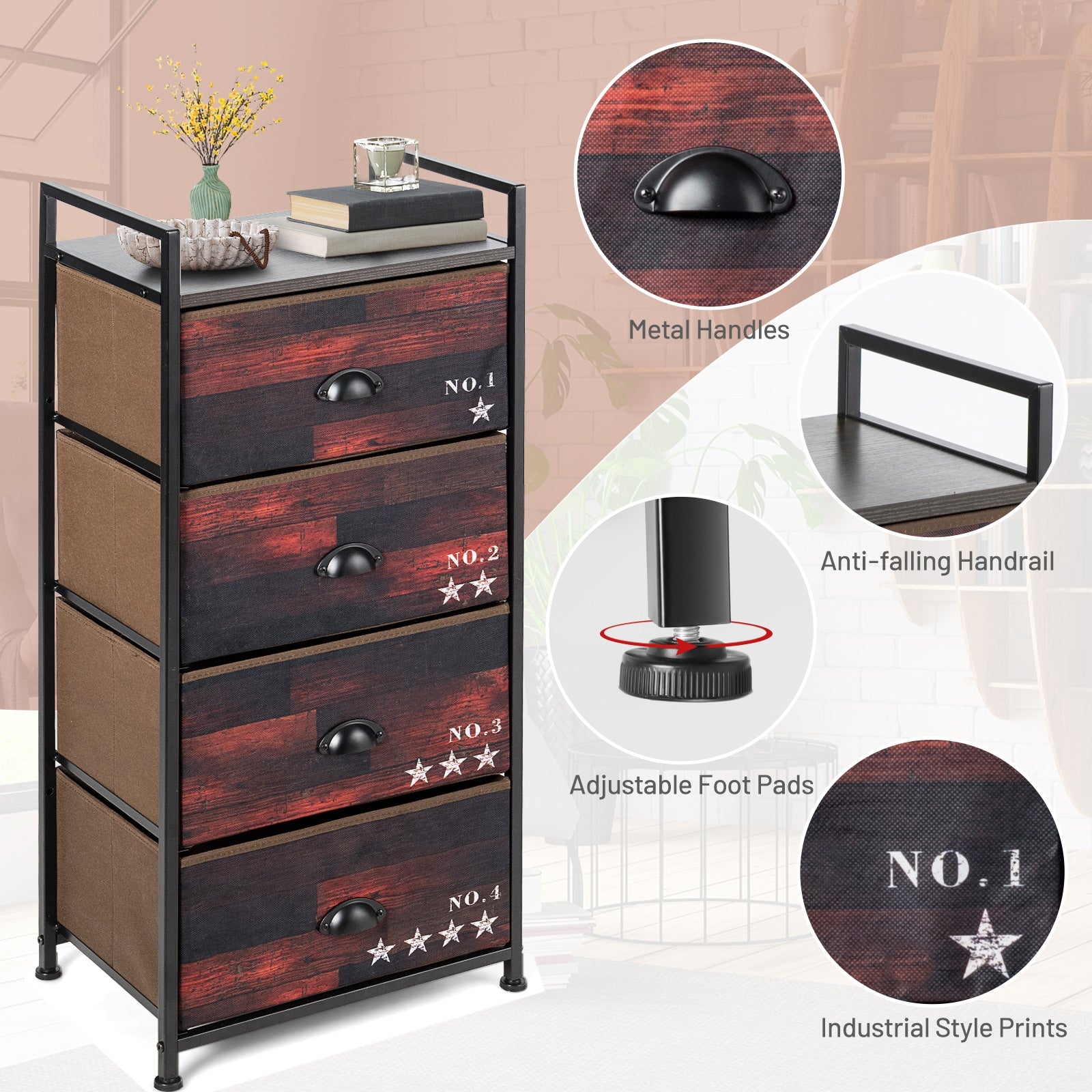 The practical and simple storage tower with 4 drawers. With a strong metal frame and a durable wooden table top this storage tower is very stable and has an extremely long service life. Each drawer is equipped with MDF board and soft non-woven cloth which can give you a good use experience. The large and spacious drawers allow you to place various items such as clothes towels help you make the most of the limited space. The high load-bearing top also provides ample display space for your decorations. Its unique appearance and versatile design allow it to be used in bedroom living room or any other rooms. The lightweight frame and foldable drawers make this storage tower very easy to transport and store when not in use. If you are looking for it don't hesitate to buy it! Strong metal frame construction ensures stability and safety Adjustable feet can be used on uneven ground Non-woven drawers can be folded 4 drawers provide sufficient storage space and keep everything in order Wooden top for placing decorations photo frames and potted plants The smooth surface is waterproof and easy to clean. Perfect for bedroom living room study and office The unique printed finish is very easy to attract people's attention Lightweight design for easy movement Easy to assemble with clear instruction