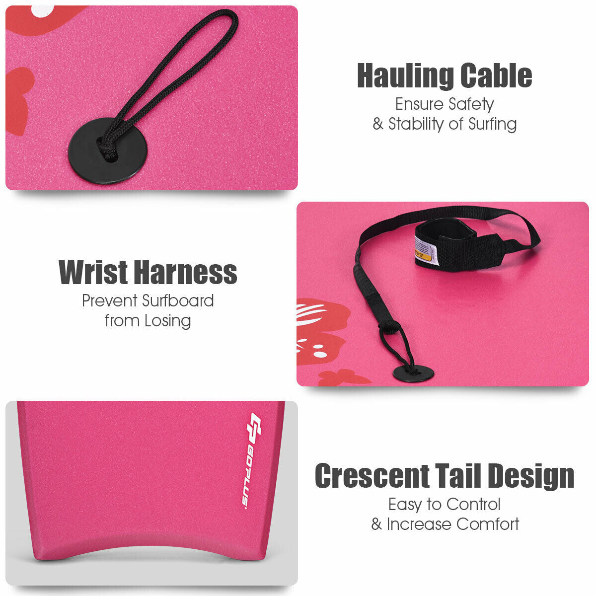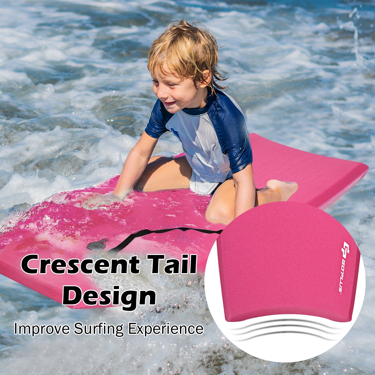 Not easy to break or deform due to the durable EPS core Waterproof XPE deck has good impact resistance and durability Smooth HDPE bottom greatly reduces the friction during surfing Ultra-light in weight makes bodyboard very easy to carry wherever you go It has excellent buoyancy and strong load-bearing capacity Leash and wrist rope design improves safety and stability during surfing The bodyboard has 60/40 rails rear channels and a crescent tail Bright colors and stylish design attract attention from the seaside Suitable for water sports giving you a wonderful outdoor surfing experience