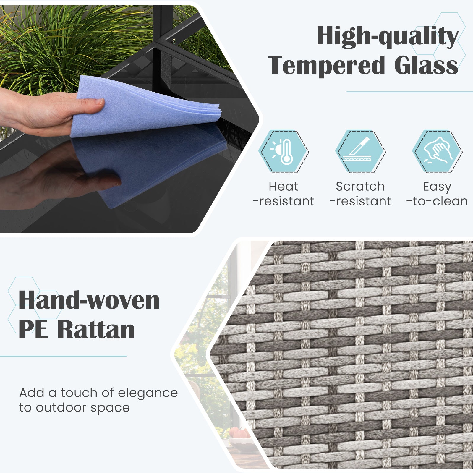 High-quality tempered glass is heat-resistant scratch-resistant and easy-to-cleanOffers versatile storage options with open shelves and 8 removable hooksHand-woven PE rattan will add a touch of elegance to outdoor space2 support feet with adjustable foot pads keep the cart stable2 lockable universal casters for easy mobilityThoughtful design of magnetic door catches prevents accident openingSuction pads keep the glass top secure and in placeIntegrated handles and convenient knobs ensure a pleasant user experienceSuitable for buffets and BBQ parties