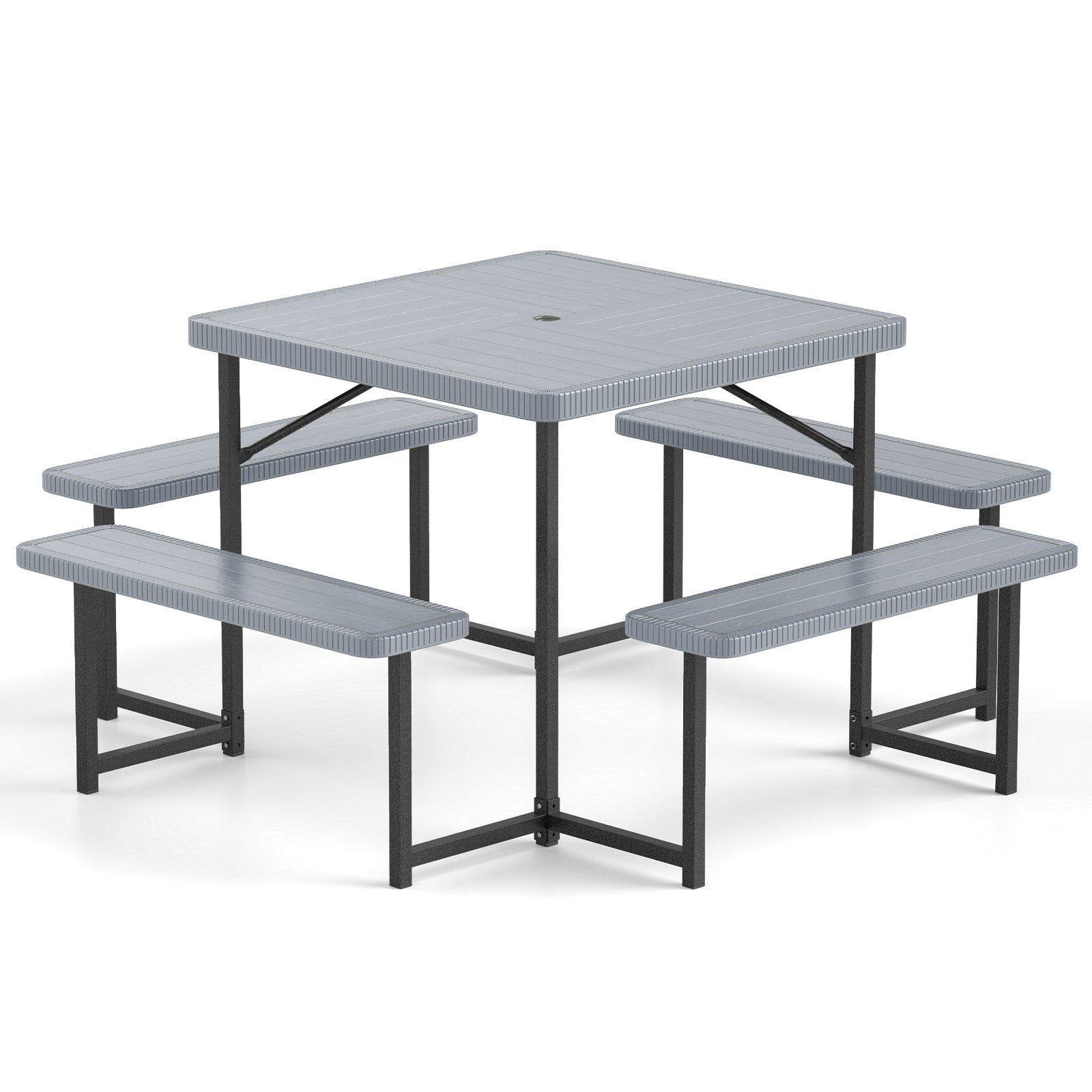 Outdoor Square Picnic Table Bench Set for 4-8 People with Umbrella Hole-Gray