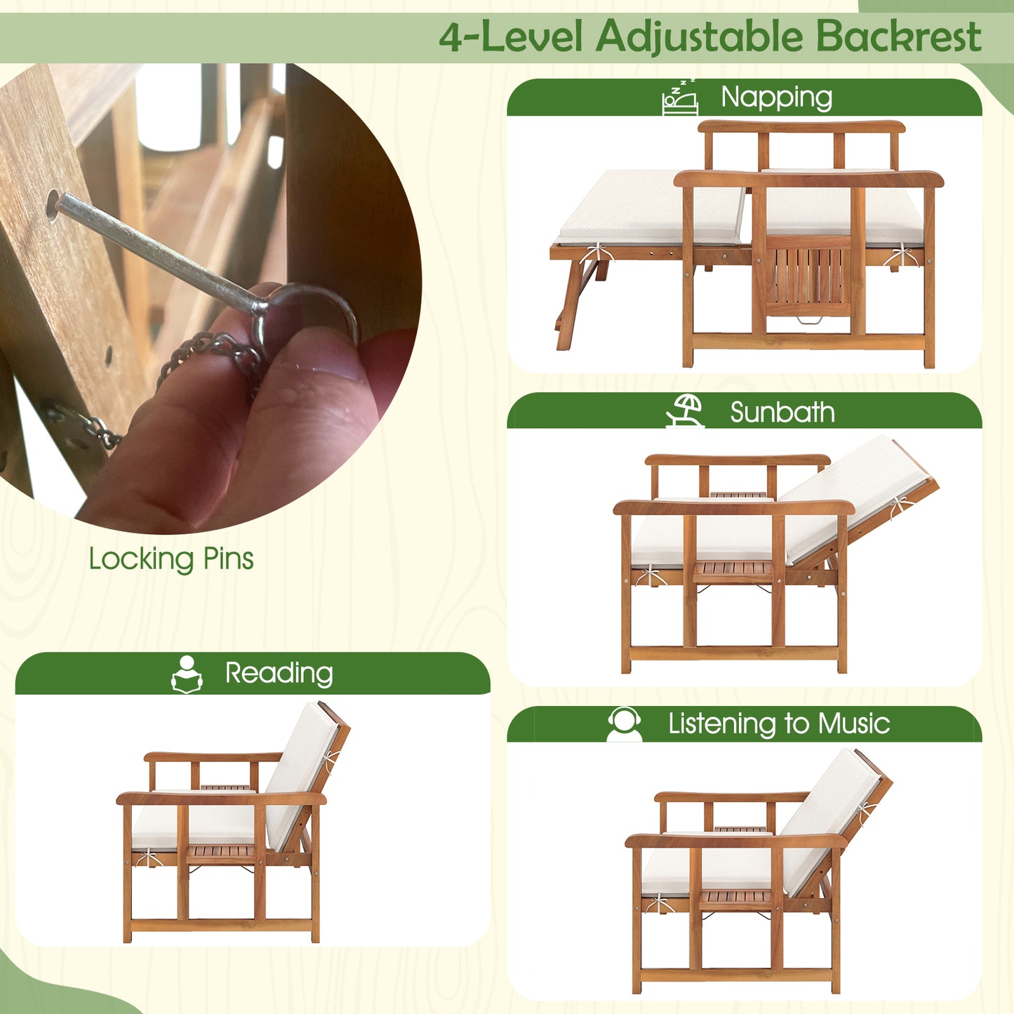 4-level adjustable backrest meets your different relaxing demands Acacia wood frame provides strong support and withstands the test of time Both the loveseat and ottoman can load up to 360 kg Cozy to sit with soft cushions and pillows Curved armrests make you more relaxed 2 folding side tables for more convenience Lock of storage box for higher security Protective liner keeps items in the ottoman in good condition Reinforced metal hinges for safe open and close Cushon covers with zippered design for easy maintenance Fixing ties keep the cushions in place Multifunctional ottoman for better relaxing experience Suitable for backyard poolside front porch and so on Please care the wood with maintenance oil regularly Please avoid rain exposure for prolonged service life Assembly is required