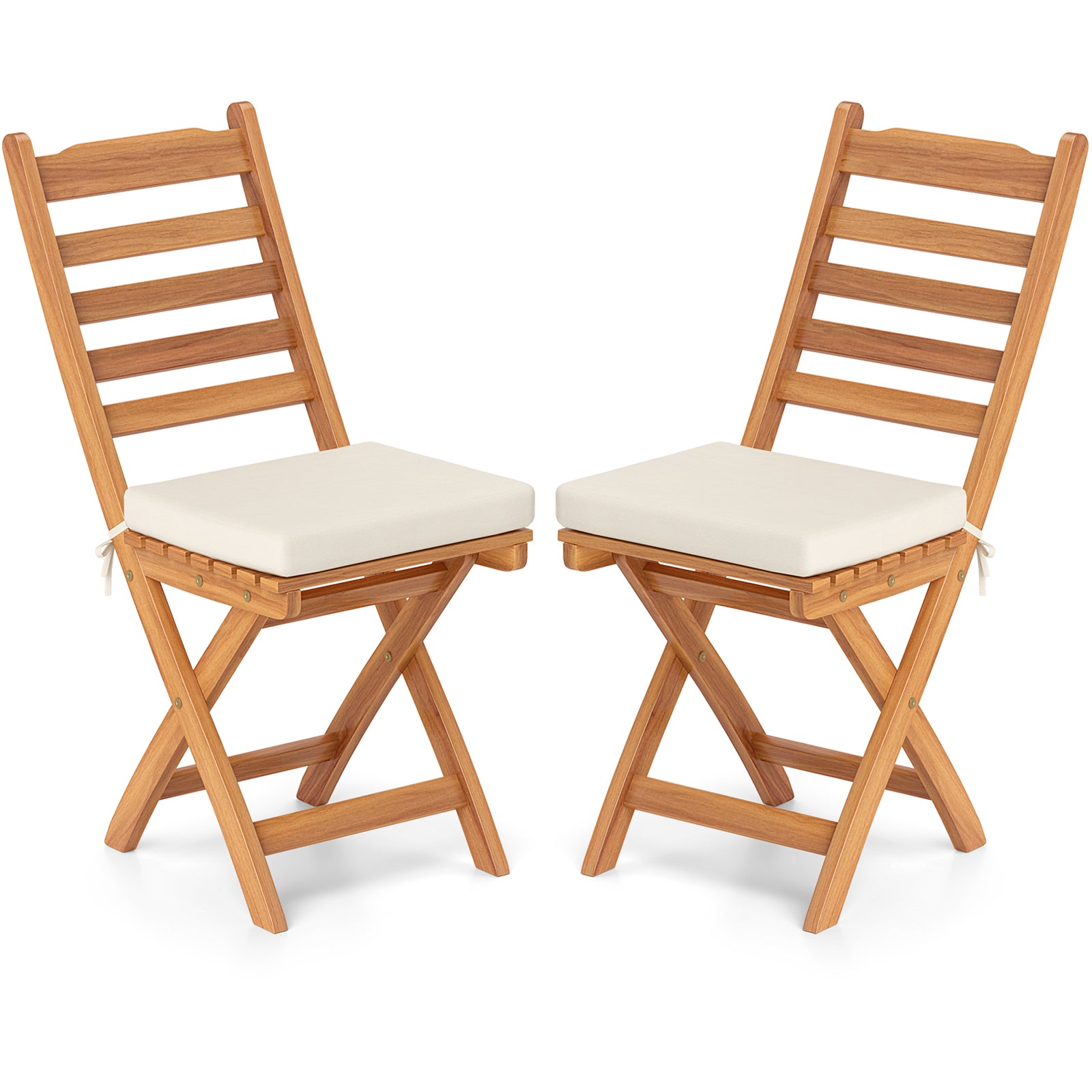 High-quality acacia wood frame for long-term outdoor useQuick folding design for space-saving storage and effortless carryingHigh-backrest with 115° angle for cozy back supportSoft seat cushions make you more relaxedReinforced X-shaped structure for higher stabilitySlatted design of seat for added cozinessNatural wood color for more eleganceNo assembly required for chairsPerfect for backyard balcony and poolside