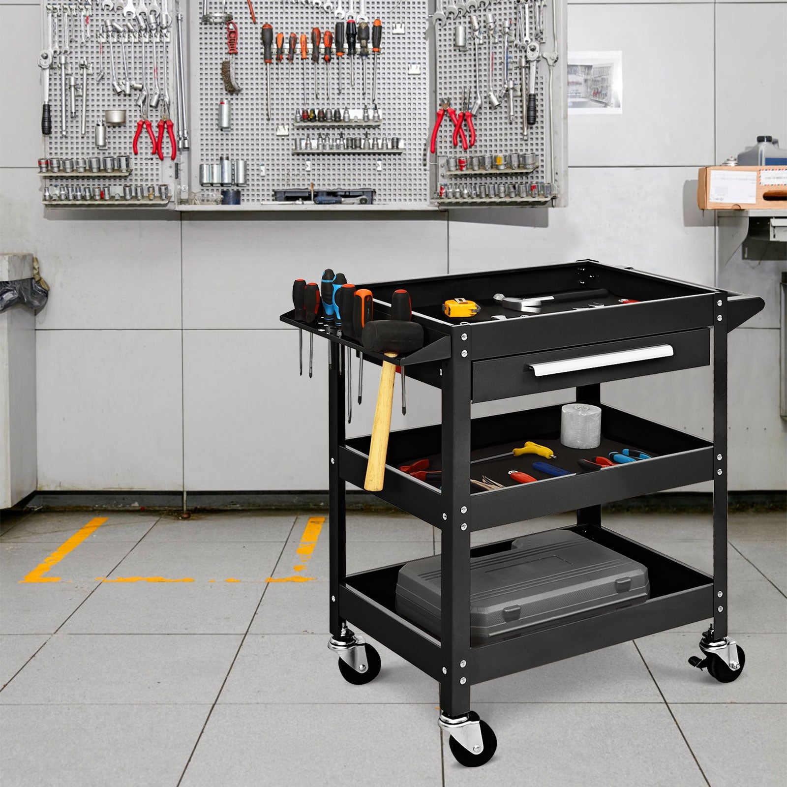 Three trays a drawer an organizer shelf and spacious space for storageMade of heavy-duty steel with a maximum load capacity 330 poundsGaze surface powder coated finished resists rust and corrosionStorage drawer with side handle smooth slides for pushing and pullingFour 360-degree rotation casters for easy moving (two of them are lockable)Nonslip cushion is convenient for placing and taking preventing damage to toolsEasy to assemble the accurate combination of parts and a detailed instructionSophisticated appearance suitable for workshop garage warehouse and more