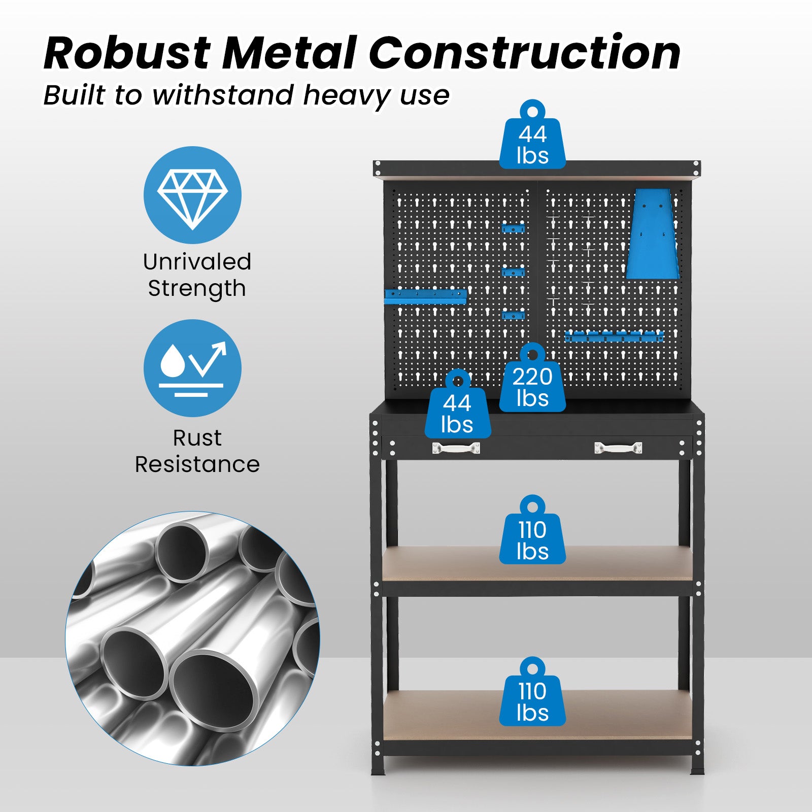 Wide tabletop top shelf 2 drawers and 2 bottom shelves offer ample storage spaceEquipped with 2 pegboards and 14 hanging accessoriesHeavy-duty metal frame ensures high stabilityPlastic sprayed surface resists to rust for long-time useAnti-slip footpads protect the ground from scratchesSuitable for garage tool room workshop and so onClear instruction for high-efficiency assembly