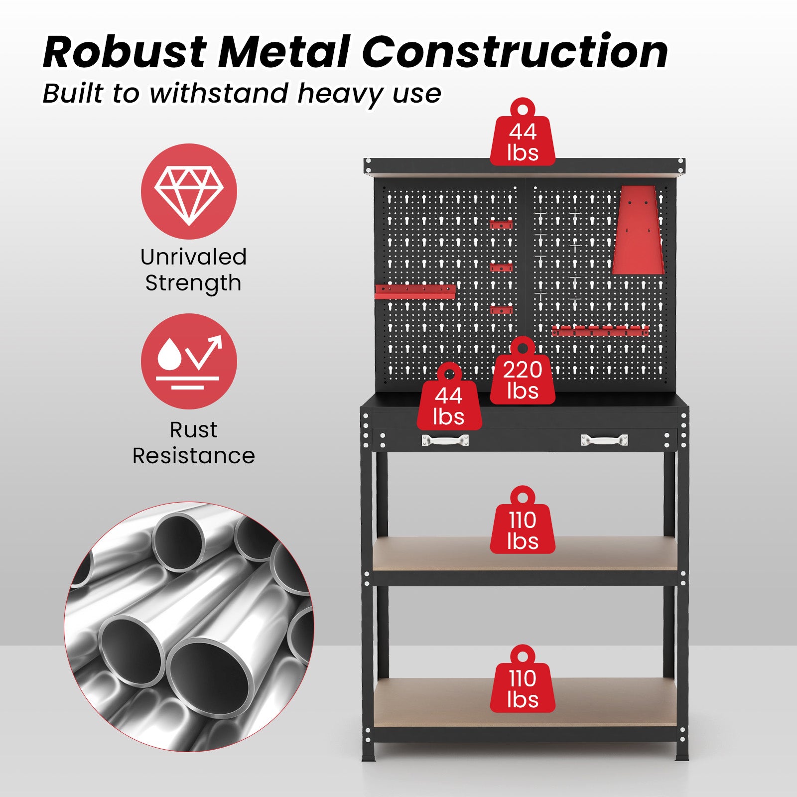 Tool Storage Workbench with Pegboard with 14 Hanging Accessories for Garage-Black and Red
