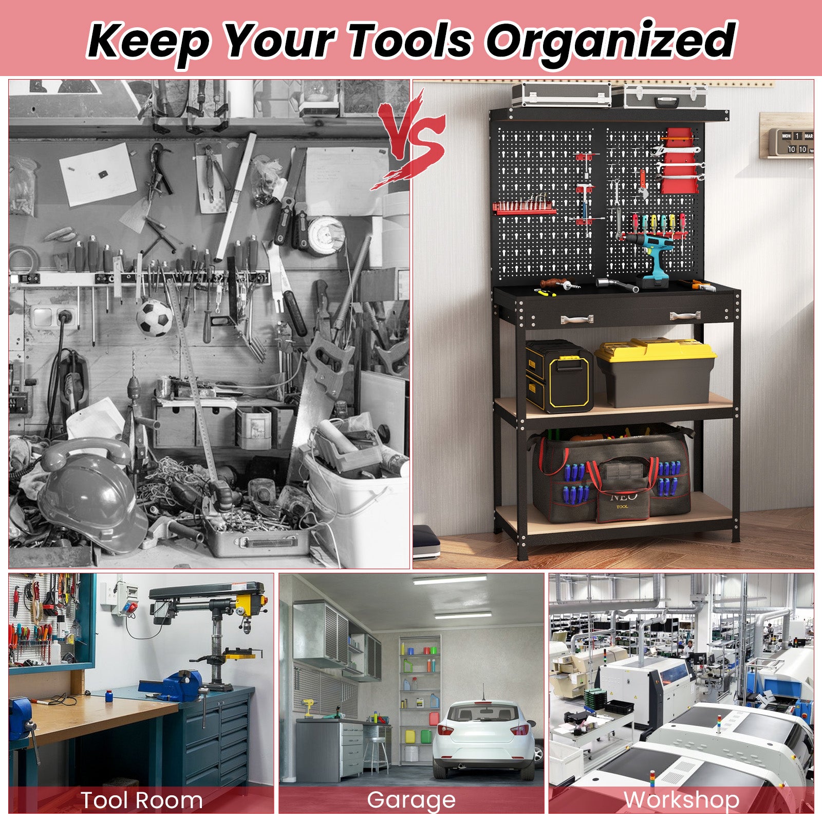 Wide tabletop top shelf 2 drawers and 2 bottom shelves offer ample storage spaceEquipped with 2 pegboards and 14 hanging accessoriesHeavy-duty metal frame ensures high stabilityPlastic sprayed surface resists to rust for long-time useAnti-slip footpads protect the ground from scratchesSuitable for garage tool room workshop and so onClear instruction for high-efficiency assembly