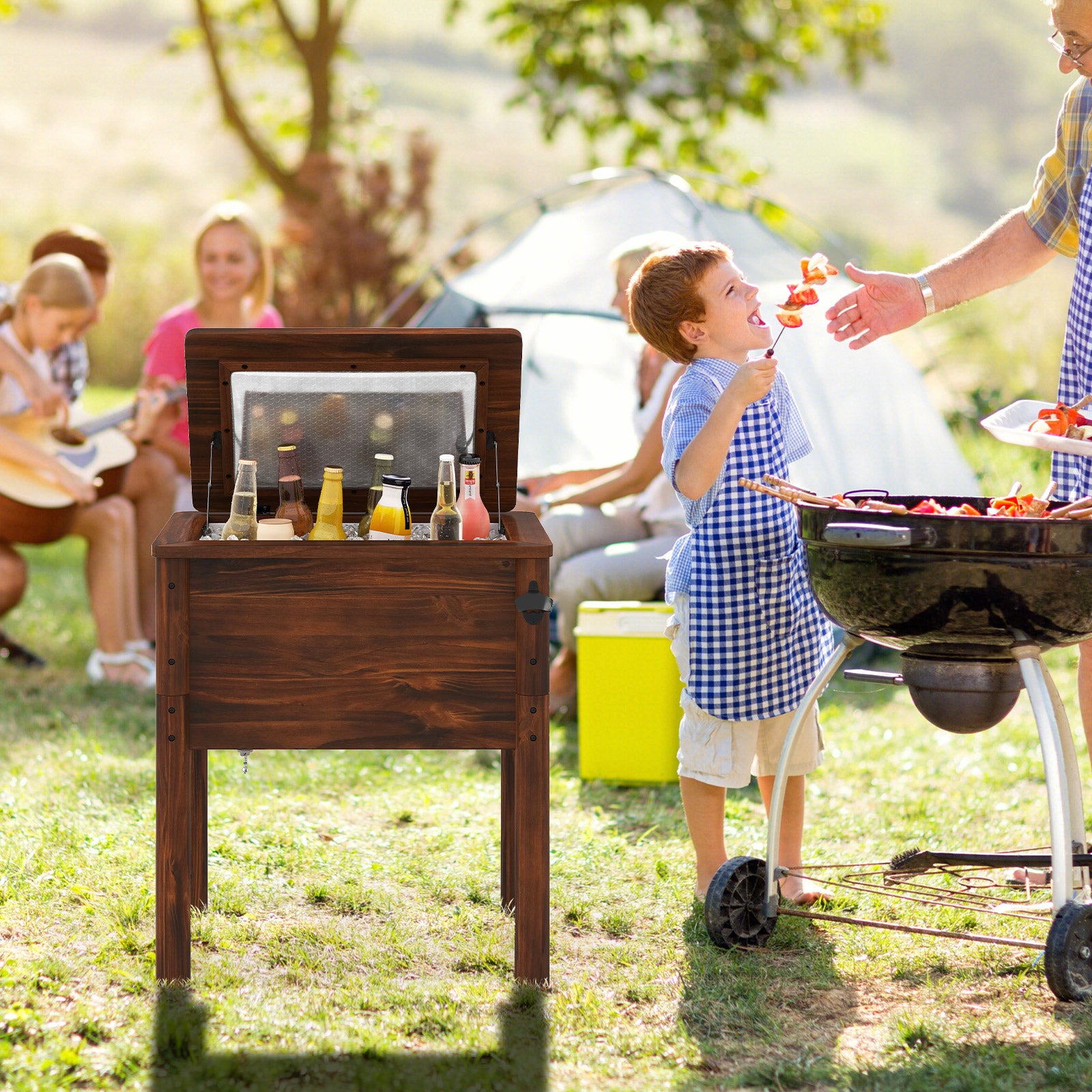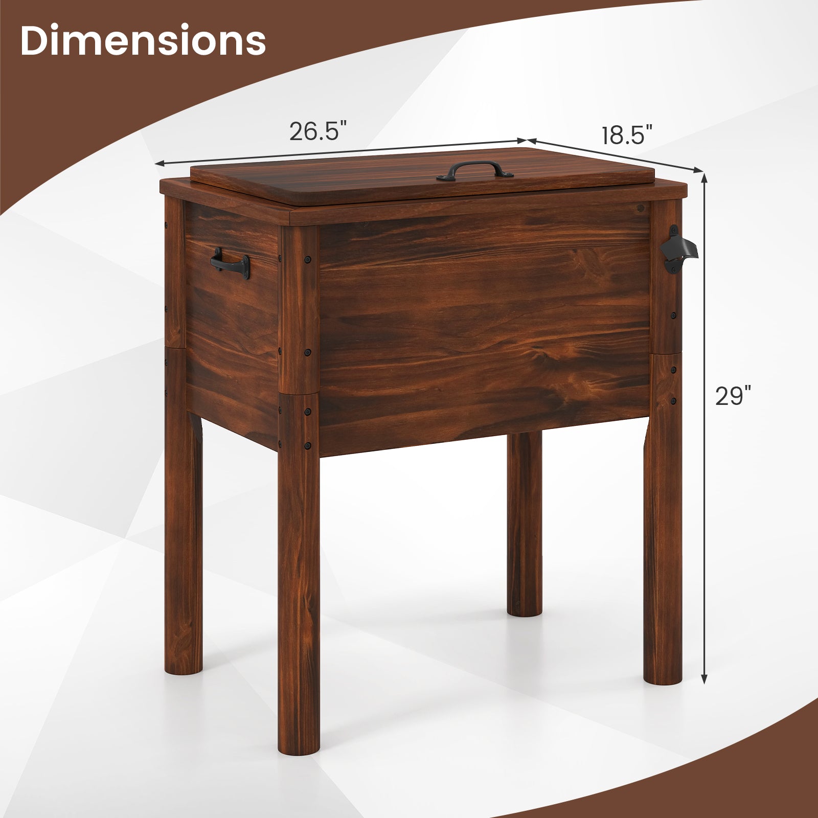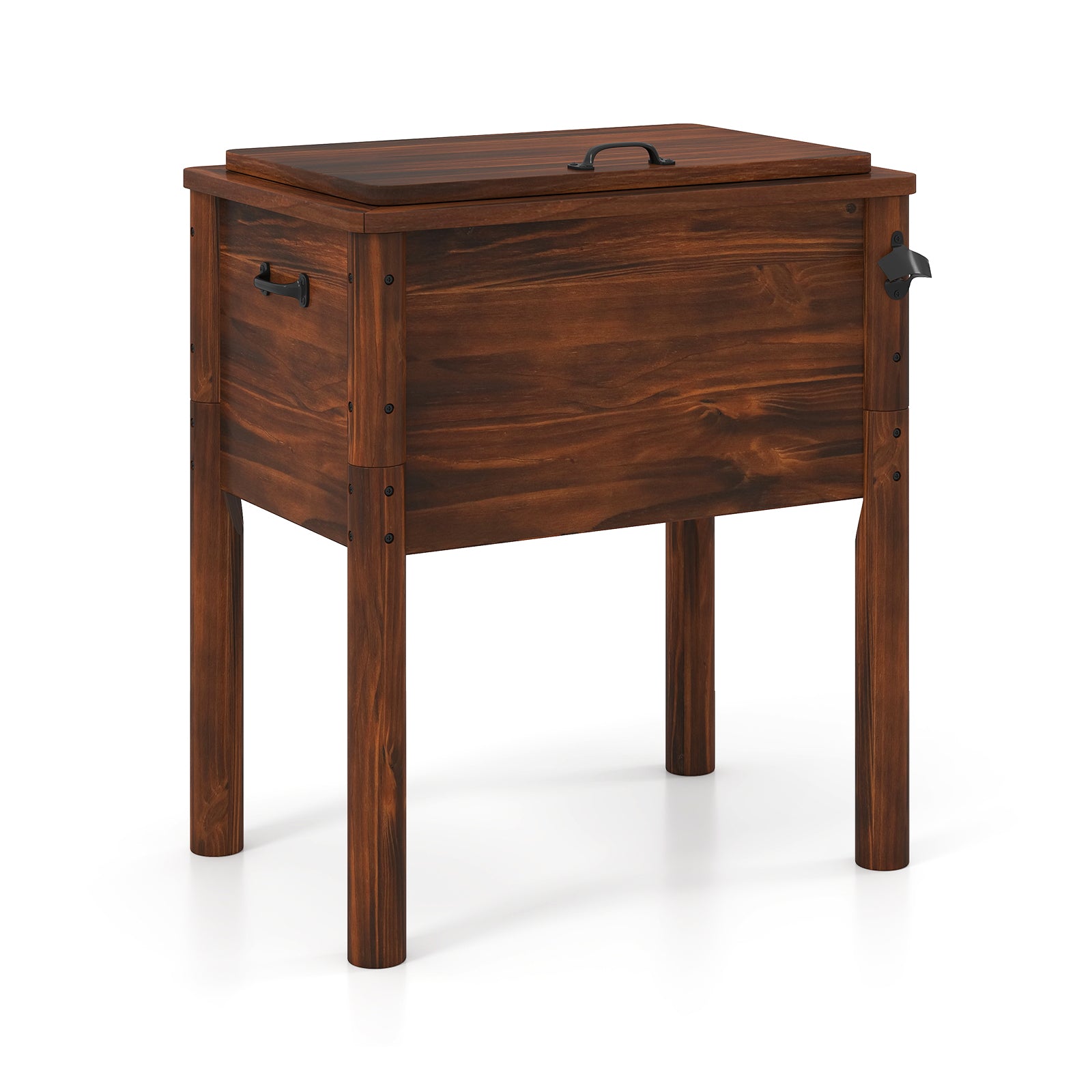 Solid pine wood frame provides strong stability and durability3-layer insulation to keep your drinks chilled or snacks warm54 qt large capacity to accommodate a great amount of drinks Top lid with handle for easy opening and access to the itemsPop open a cold drink easily thanks to the bottle openerDrainage cap simplifies the process of emptying water Side handles make it easy to transport and relocateSmooth and waterproof surface for easy upkeepIdeal for patio poolside yard party and moreAssembly needed